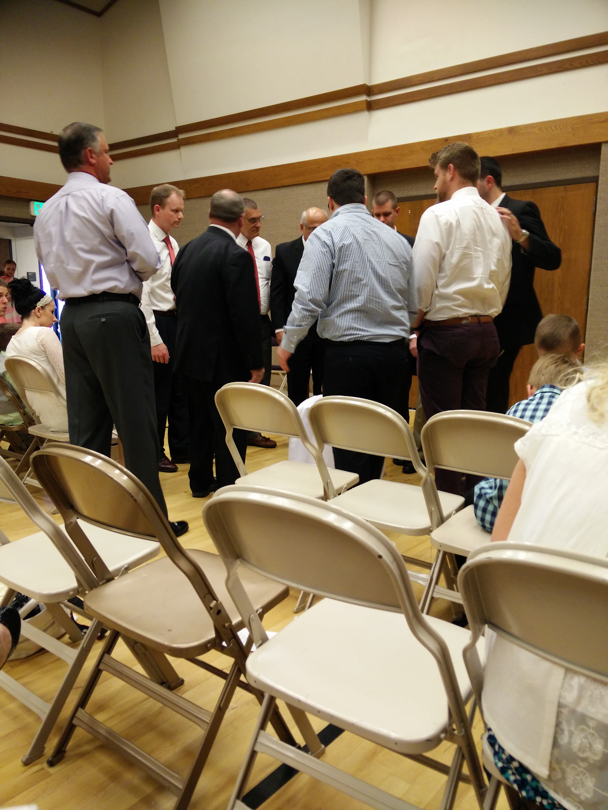Po několika rozhovorech, otevírají dveře ke křtitelnice. Věříme, že ponoření je nezbytné. Proč, opravdu nevím, ale je to symbol znovuzrození. Ta křtitelnice existuje v každém mormonském kostele. Normálně, malé děti se přiblížení, aby bylo vidět. Nevidíš tam dobře na obrázku. Dveře do font vedou do koupelny pro muže a ženy. Velké zrcadlo pomáhá lidem vidět.